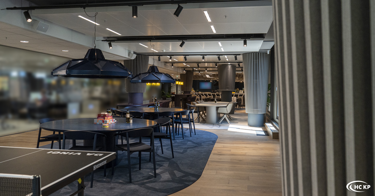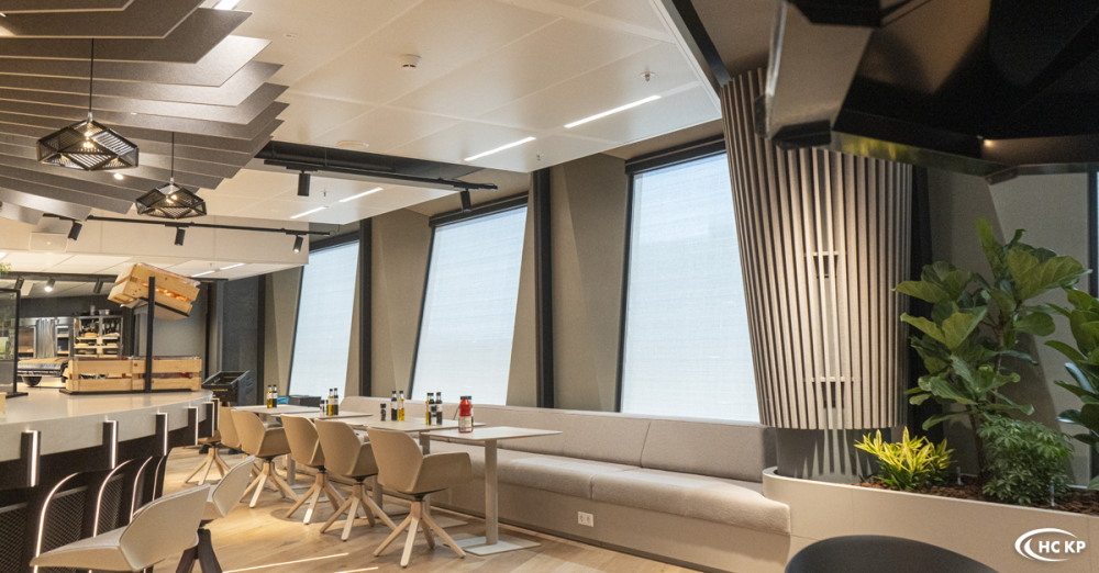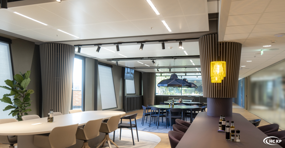 In opdracht van Bosman Bedrijven leverde en monteerde HC KP diverse klimaatplafondeilanden, inclusief geïntegreerde armaturen. Tijdens het ontwerptraject zijn verschillende plafondopties afgewogen. Vanwege de schuine gevels en de wens om de architectonische lijnen te volgen, is gekozen voor een opbouw met een G-kaderconstructie. Deze constructie maakt het mogelijk om de plafondeilanden nauwkeurig te laten aansluiten op de contouren van het gebouw en om hoekverdraaiingen elegant op te vangen.